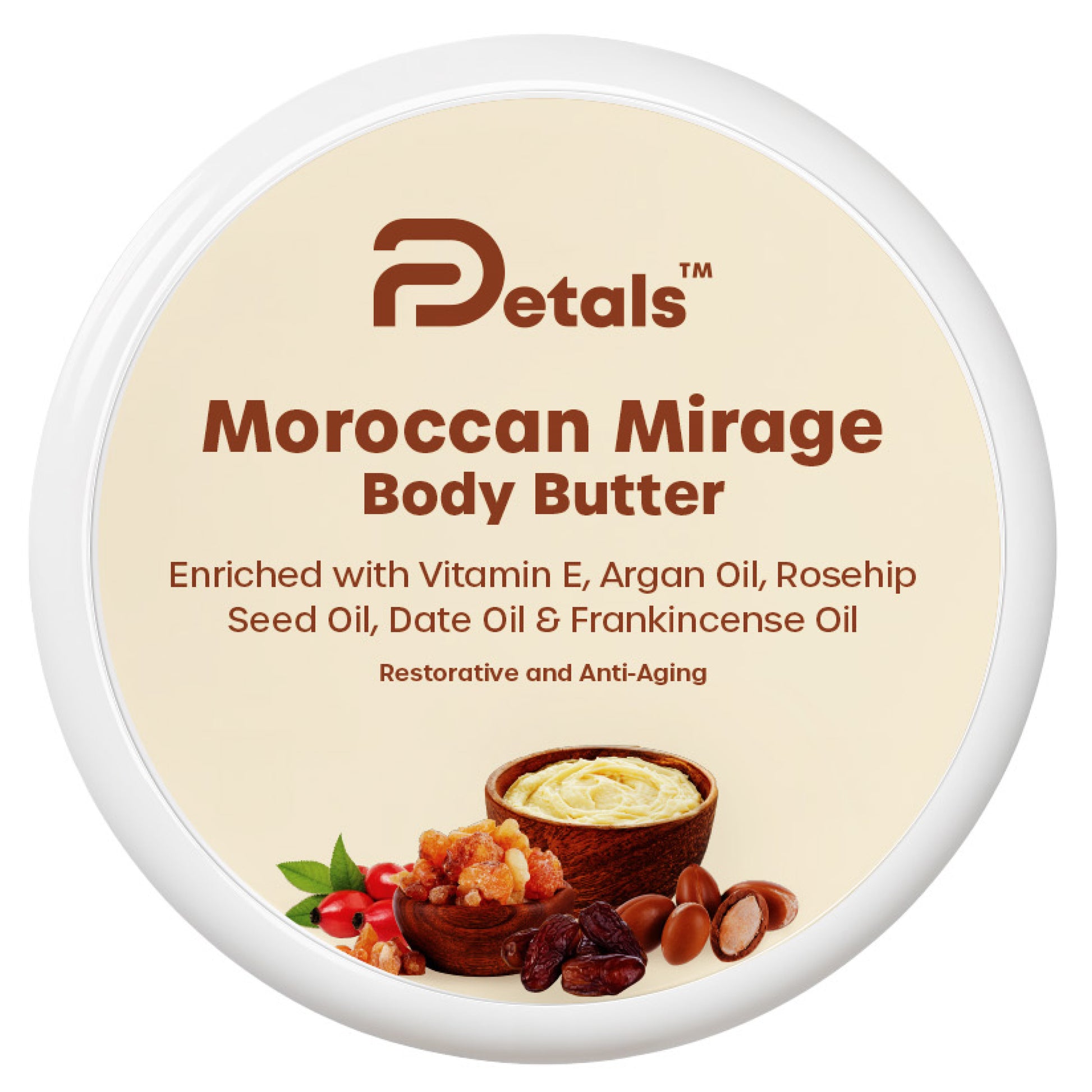 Rejuvinate your skin with luxurious Moroccan Mirage Body Butter from DPetals - a nourishing blend of Vitamin E, Argan Oil, Rosehip Seed Oil, Date Oil, and Frankincense Oil. This deeply moisturising body butter is non-comedogenic, ensuring it won't clog your pores. Enriched with Vitamin E, it provides antioxidant protection and promotes a youthful glow. Crafted without harsh chemicals, this body butter is gentle on your skin. Restore your skin's radiance and combat signs of ageing with this restorative and anti-ageing body butter. Pamper yourself with the rich, indulgent texture and the captivating aroma of this Moroccan-inspired body butter.